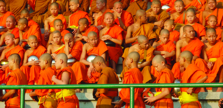 Los acontecimientos exigen que corramos al mercado local a comprar nuestras propias prendas amarillas, no sólo por respeto a la ocasión, sino para asistir a una ceremonia de donación de alimentos a más de mil monjes en el estadio de la ciudad para la cual nuestra guía previamente ha conseguido los permisos de entrada. Les llevaremos comida al igual que lo harán todos los ciudadanos. Tradicionalmente, los hombres han de pasar un año en el monasterio en el momento que ellos mismos lo decidan. Solteros, casados, viejos, jóvenes, no importa. Al ordenarse, vestirán las llamativas túnicas naranjas, su cabeza rapada pondrá de manifiesto su compromiso con Buda, y los mechones de su pelo quedarán guardados en un paño blanco. Al igual que todos los fieles depositamos los alimentos en sus cuencos metálicos tras verles desfilar silenciosa y devotamente, con su frente gacha ante los donantes. Una experiencia que pone de manifiesto la fe de un pueblo para alcanzar el nirvana a través del bien común.