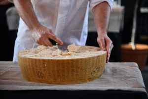 Cortar una rueda del emblemático Parmigiano Reggiano es todo un arte, casi tanto como la elaboración artesanal de este famoso queso italiano, que se mantiene inalterable desde hace siglos. Asistimos a un ritual que eleva a su máxima expresión todos los matices de este queso.